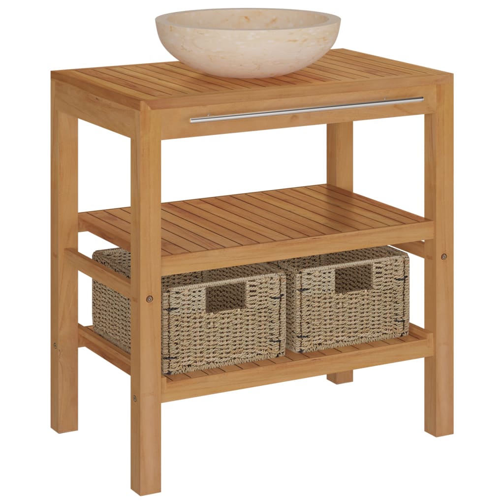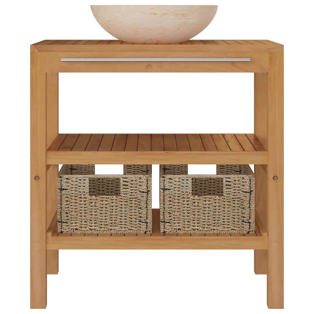 Il mobile sotto lavabo è costruito in legno massello di teak, che è abbastanza resistente e robusto per porre un lavandino sopra, insieme ad altri accessori da bagno. L'armadietto di vanità ha un corrimano per appendere asciugamani o vestiti. Dispone inoltre di quattro gambe di sostegno per garantire stabilità e protezione dall'umidità dal suolo. Il suggestivo lavabo è facile da usare per l'uso quotidiano ed è un meraviglioso ornamento per il vostro spazio abitativo. I 2 cestini sottostanti rendono il vostro bagno pulito e ordinato con le cose riposte. Completamente realizzato a mano in marmo grazioso, il lavabo è estremamente robusto con un aspetto elegante. Inoltre, il lavabo è molto facile da pulire. Il mobile si inserisce perfettamente sotto il lavandino e rende molto comodo lo stoccaggio nel bagno.