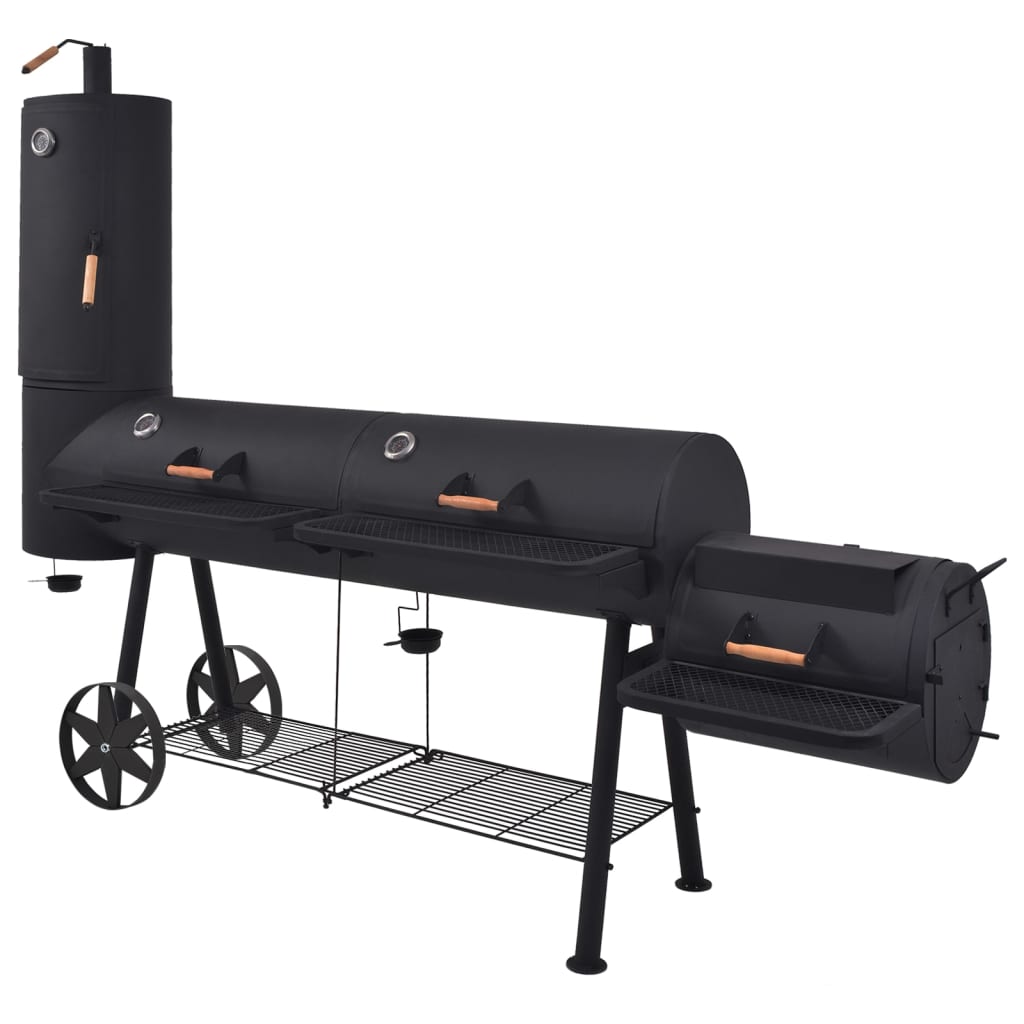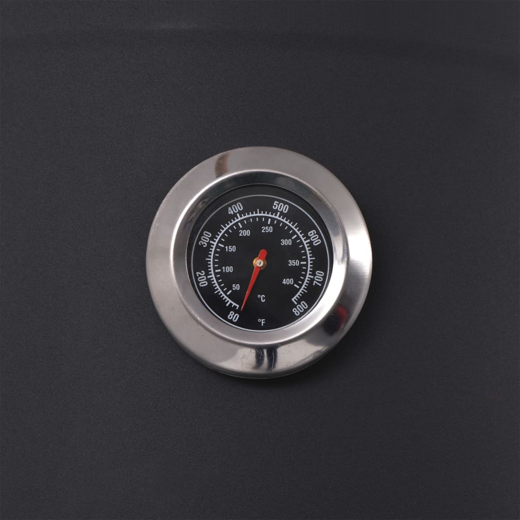 La struttura metallica, ermeticamente sigillata e spessa, è pesante e conferisce al nostro affumicatore eccellenti caratteristiche di ritenzione e distribuzione del calore. È possibile monitorare la temperatura delle camere con i termometri integrati. L'affumicatore è dotato di un ripiano nella parte anteriore del focolare e di un altro ripiano più grande sotto le camere di cottura su cui è possibile riporre spezie, ingredienti, utensili e altri elementi necessaria per il barbecue. Grazie alle impugnature in legno, l'apertura delle camere è sicura e comoda. Questo affumicatore di grandi dimensioni è dotato di 2 ruote, quindi può essere facilmente spostato per feste all'aperto, picnic e raduni.