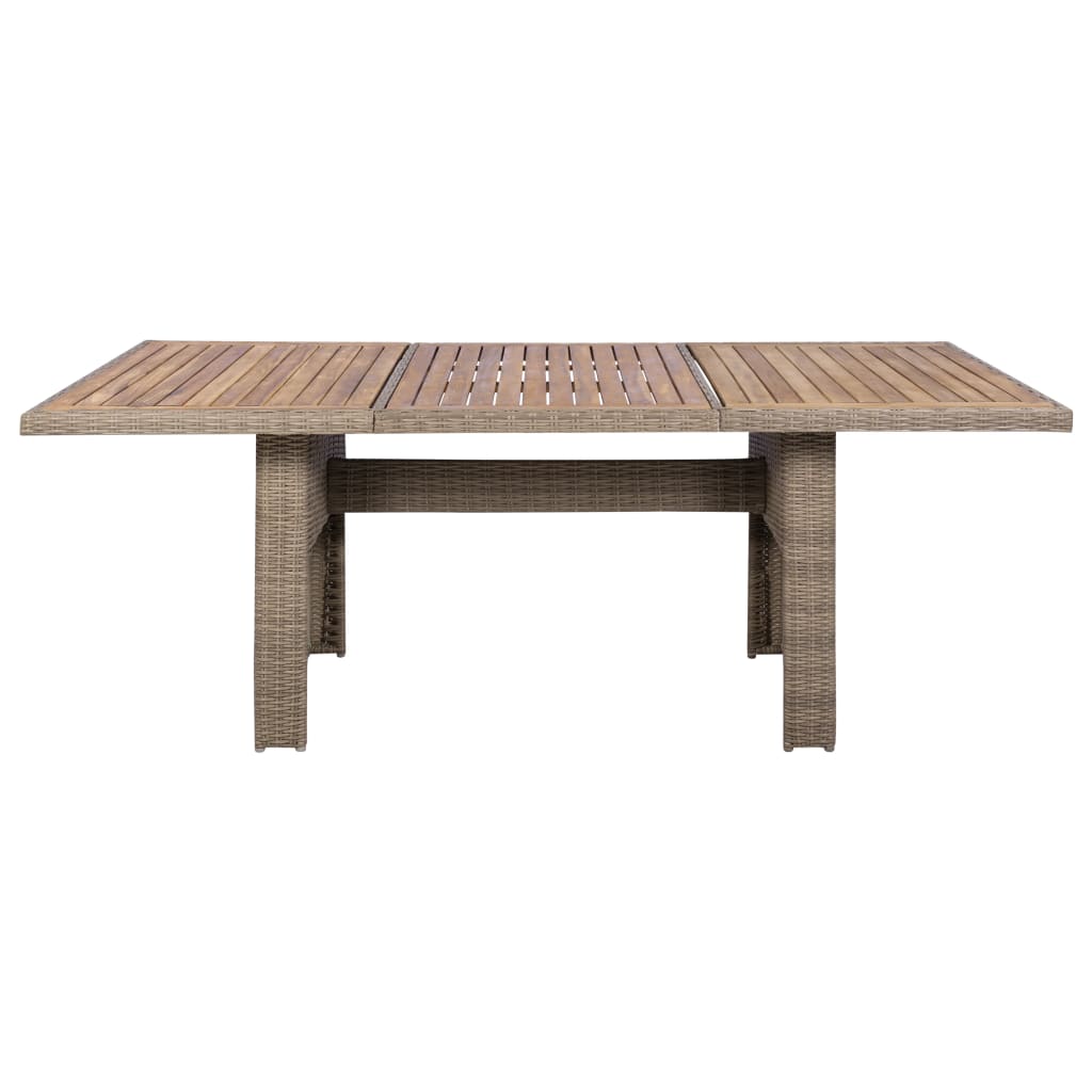 Grazie al rattan PE resistente all'acqua, il set da pranzo per patio è facile da pulire, resistente e adatto all'uso quotidiano all'aperto. Il telaio in acciaio verniciato a polvere rende il set robusto e durevole. Il piano del tavolo è realizzato in legno massello di acacia di alta qualità, un legno duro tropicale, resistente agli agenti atmosferici e molto durevole. Questo set viene fornito con cuscini di seduta molto confortevoli e imbottiti per offrire il massimo comfort di seduta. Le fodere in poliestere resistente possono essere rimosse e lavate.